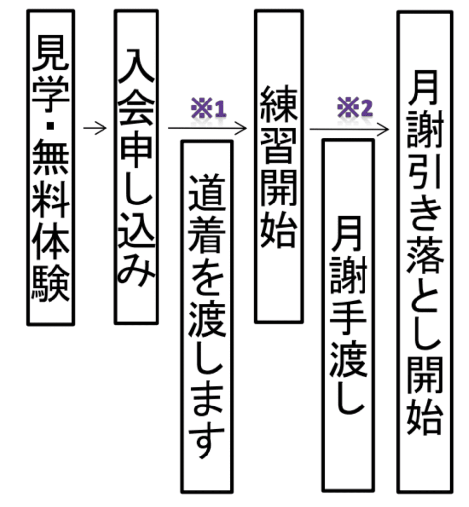 ※2:月謝は毎月1日ゆうちょ銀行からの引き落としとなりますので入会後郵便局で手続きをしていただきます。ただし入会していただいた次の月の月謝は手続きが間に合わないため手渡しでいただくことになります。